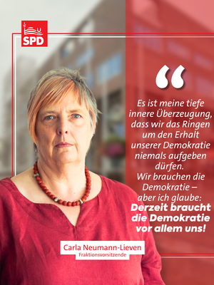 Die Vorsitzende der SPD-Ratsfraktion Carla Neumann-Lieven brachte es bereits im Februar auf den Punkt: „Es ist meine tiefe innere Überzeugung, dass wir das Ringen um den Erhalt unserer Demokratie niemals aufgeben dürfen. Lassen Sie uns schützen, was wir lieben. Wir brauchen die Demokratie – aber ich glaube: Derzeit braucht die Demokratie vor allem uns!“
